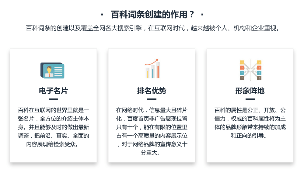 百科词条(百度词条/搜狗词条/360词条/互动词条)让企业能够最高排名,最权威的介绍,最好的展示,正常情况下百度有商业百科8600元一年。而普通的百科词条,对企业对个人来说,编辑难度相当大,如果没有权威机构站队,权威引用,很难编辑。